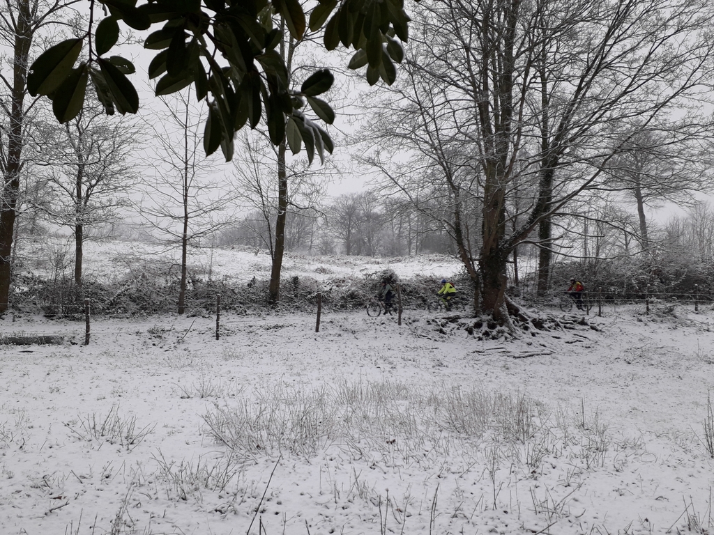 C’est par des températures négatives (-3°) que nous attaquons cette sortie dominicale, une douzaine au départ, de quoi faire 2 groupes égaux se suivant à vue 😉, nous sommes tous couverts jusqu’aux oreilles, du moins c’est ce que je pensais jusqu’à ce que je découvre Jean Nic au sol le visage amoché (joue, nez et menton): nous venons tout juste de faire 1 km, le temps de monter la cote de la suifferie et dans la 1ere descente sur macadam, une coulée d’eau verglacée ne laisse aucune autre issue et l’homme de tête en fait les frais. Grosse séance de soins avec l’assistance d’un riverain (un grand merci à lui) on repart un peu refroidi, dans la tête cette fois ci. Le sol gelé s’apprécie en nous épargnant la boue, au 5ème kilomètre un raidar dans le bois met fin aux ambitions de Ludo qui casse sa chaine et préfère en rester là et fait demi tour. Les 2 groupes continuent sur le chemin des romains puis en descendant la cote du four à chaux, la neige nous prend et en quelques minutes le sol est complètement recouvert et la sortie prend une saveur toute autre, courageusement j’ôte les gants pour immortaliser cela avec des photos. On évite une grosse descente pour ne pas glisser mais je les emmène sur un itinéraire bis qui comporte une grosse montée et cela n’amusera pas tout le monde 😆 on redevient amis une fois en haut 😉 Descente par le G.R jusque Lillebonne. Stéphane et Vincent sont cuits et rentre par la route accompagnés par Fred. Nous , on se fait la sente aux marches puis les aulnes, les jardins , l’abbaye et retour Bolbec par les derrières de la laiterie, les routes très enneigées ne laissent pas de répits mais ça a l’avantage de nous garder en température. Passage par le local pour les licences et une sortie anecdotique de faite… Bon rétablissement Jean Nicolas